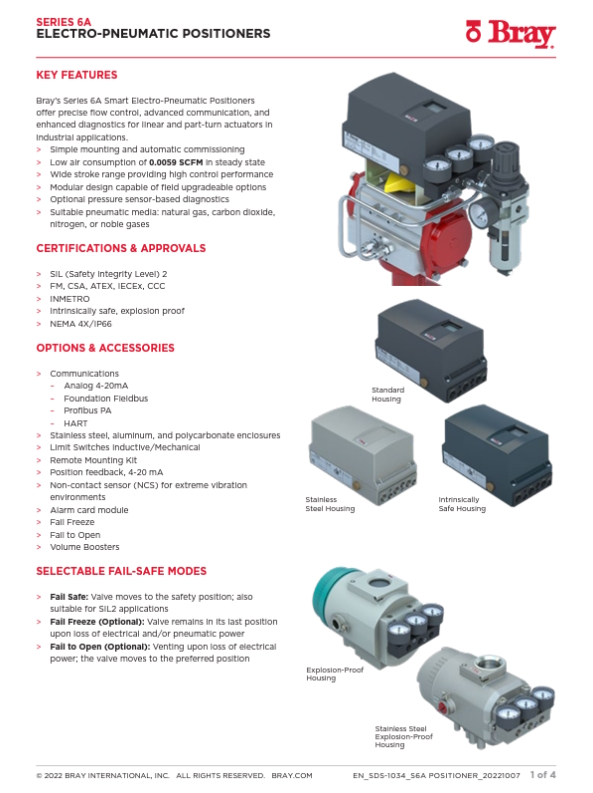 Електропневматичні позиціонери 6А забезпечують точне цифрове керування з перевіреною надійністю. Позиціонери Bray серії 6A були розроблені з урахуванням простоти встановлення, простого калібрування, ефективності та економії. У стандартній комплектації пропонуються позиціонери для поворотних приводів односторонньої та подвійної дії.